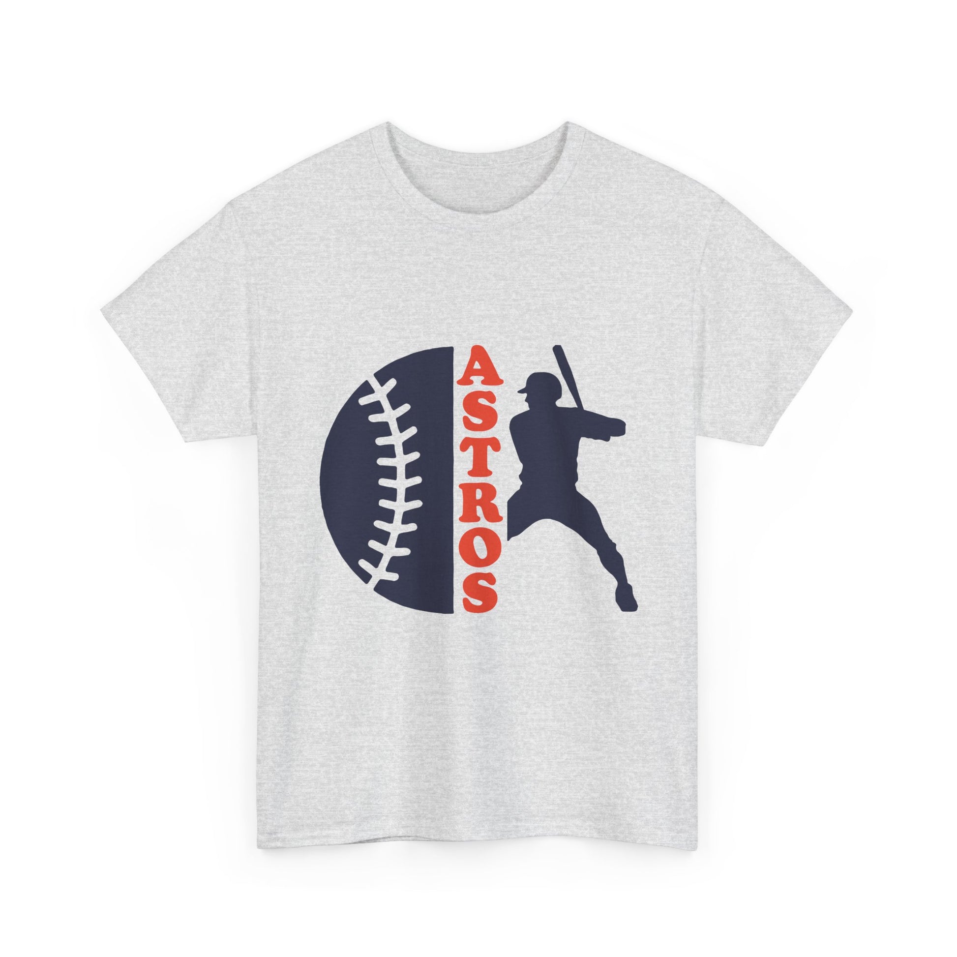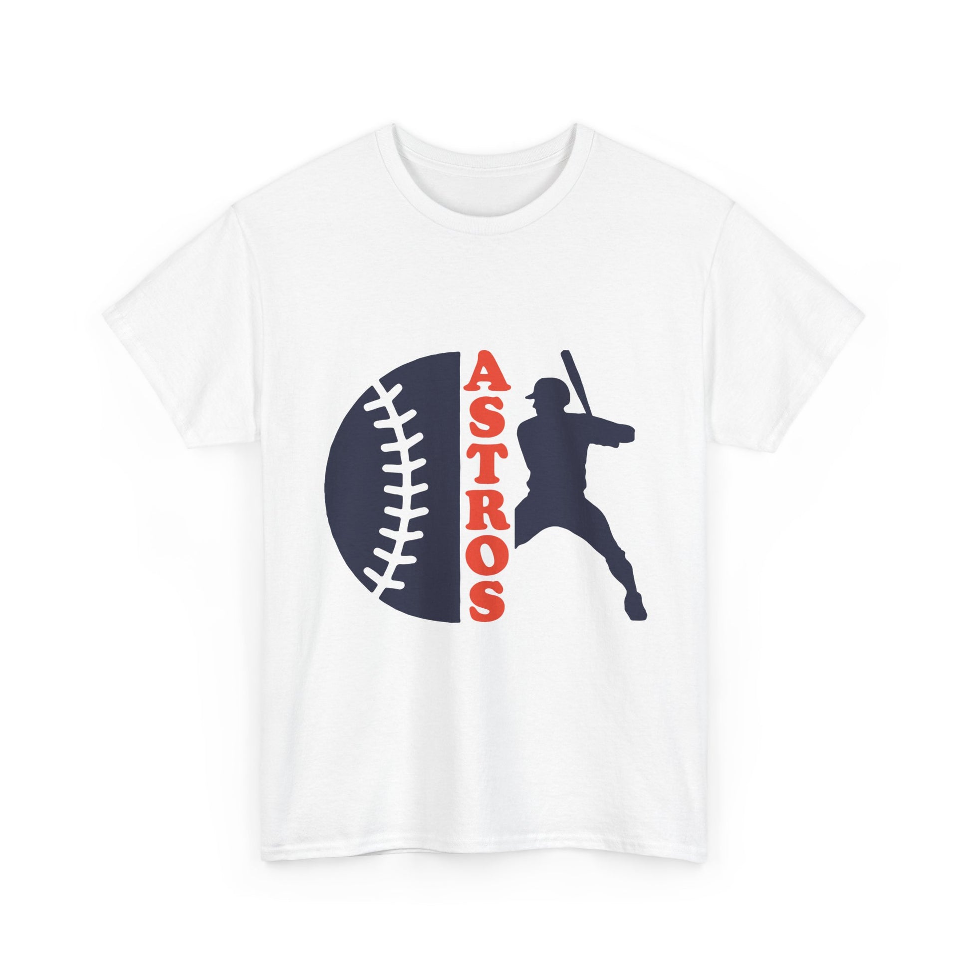 A soft, dependable tee that carries the energy of the diamond. The front shows a bold, two-tone graphic: half a stitched baseball and the silhouette of a hitter ready at the plate with a vertical “ASTROS” accent. It sits clean on a classic white background so the logo-style design reads like a team banner — casual, confident, and built for everyday wear. The shirt feels familiar from the first wear: breathable 100% cotton, midweight but not bulky, with a crew neckline that holds its shape. Wear it to practices, town league nights, or to cheer from the stands — it layers easily under a jacket or pairs with jeans and a cap for a game-day look with minimal fuss.