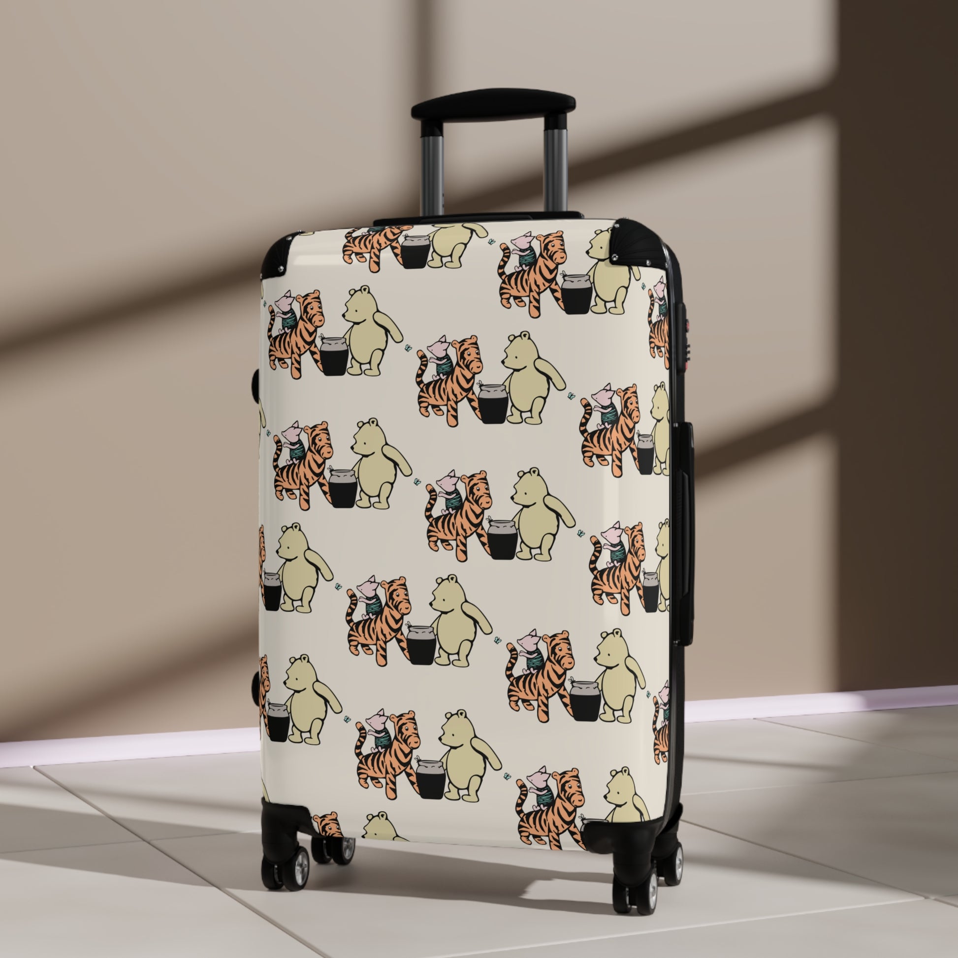 Slide open the telescopic handle and let this cheerful hard-shell suitcase nudge you toward the next small adventure. The polycarbonate front captures a playful repeating print of cozy animals—soft tones on a cream background—while the black ABS back keeps things grounded and scratch-resistant. It feels light when you lift it, but solid when you wheel it through crowded terminals: four double 360° swivel wheels roll smoothly, and the built-in lock and removable lined interior under a rubber seal keep belongings secure. Two inner pockets and a removable lining help tame chargers, toiletries, and travel-sized clutter. The largest size offers an extendable top when you need a little extra room. This is luggage for people who travel with a sense of warmth and whimsy—practical, durable, and quietly joyful on the move.