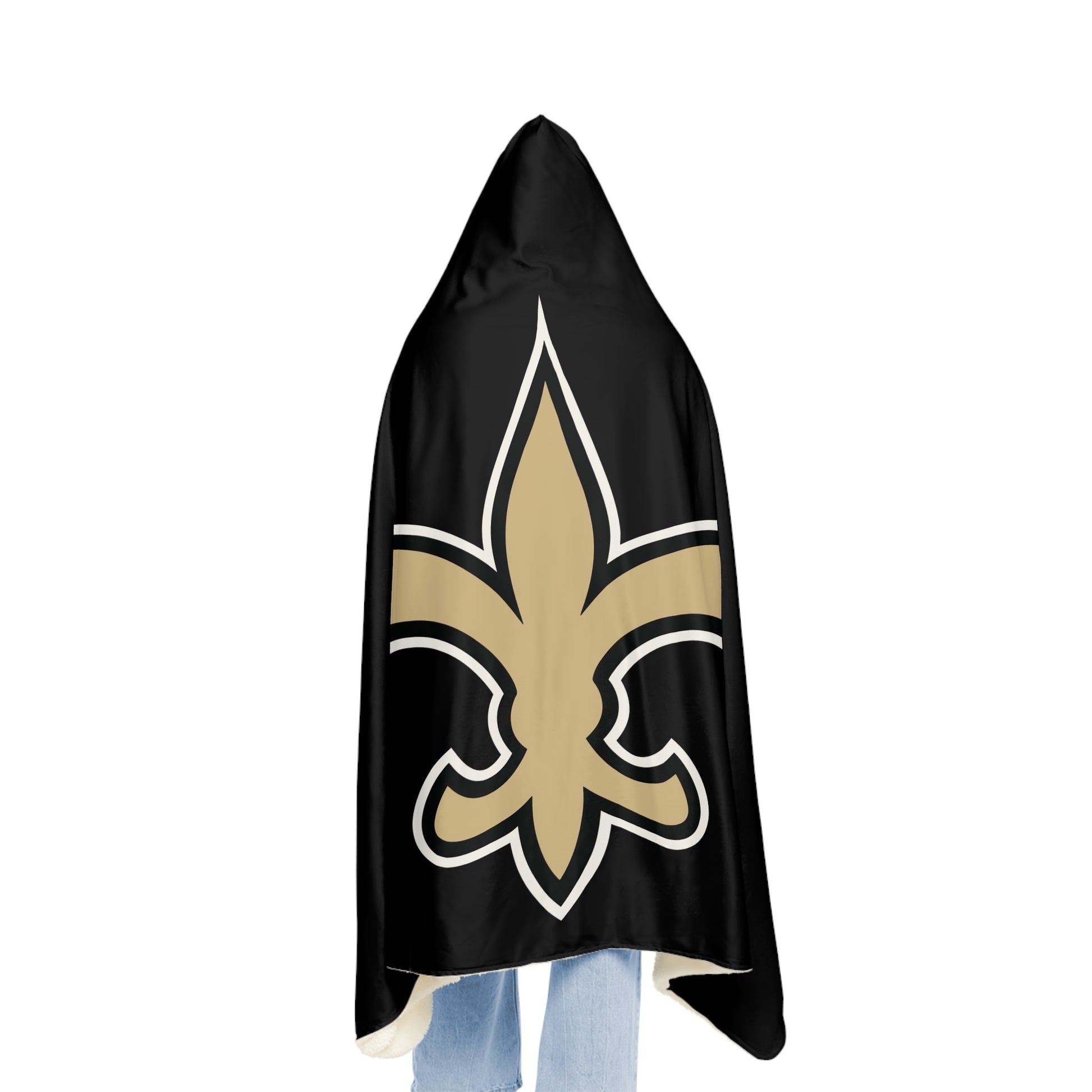 This hooded blanket wraps you in quiet game-day comfort. The deep black backdrop and bold fleur-de-lis emblem give it a classic, spirited look that settles easily into living rooms, tailgates, and chilly evenings on the porch. Wear it over jeans while catching the fourth-quarter surge, drape it across your shoulders during late-night drives home, or curl up on the couch with the sherpa lining against your skin. The oversized hood and generous dimensions create a cozy cocoon without feeling bulky — made for fans who want warmth and presence in equal measure.