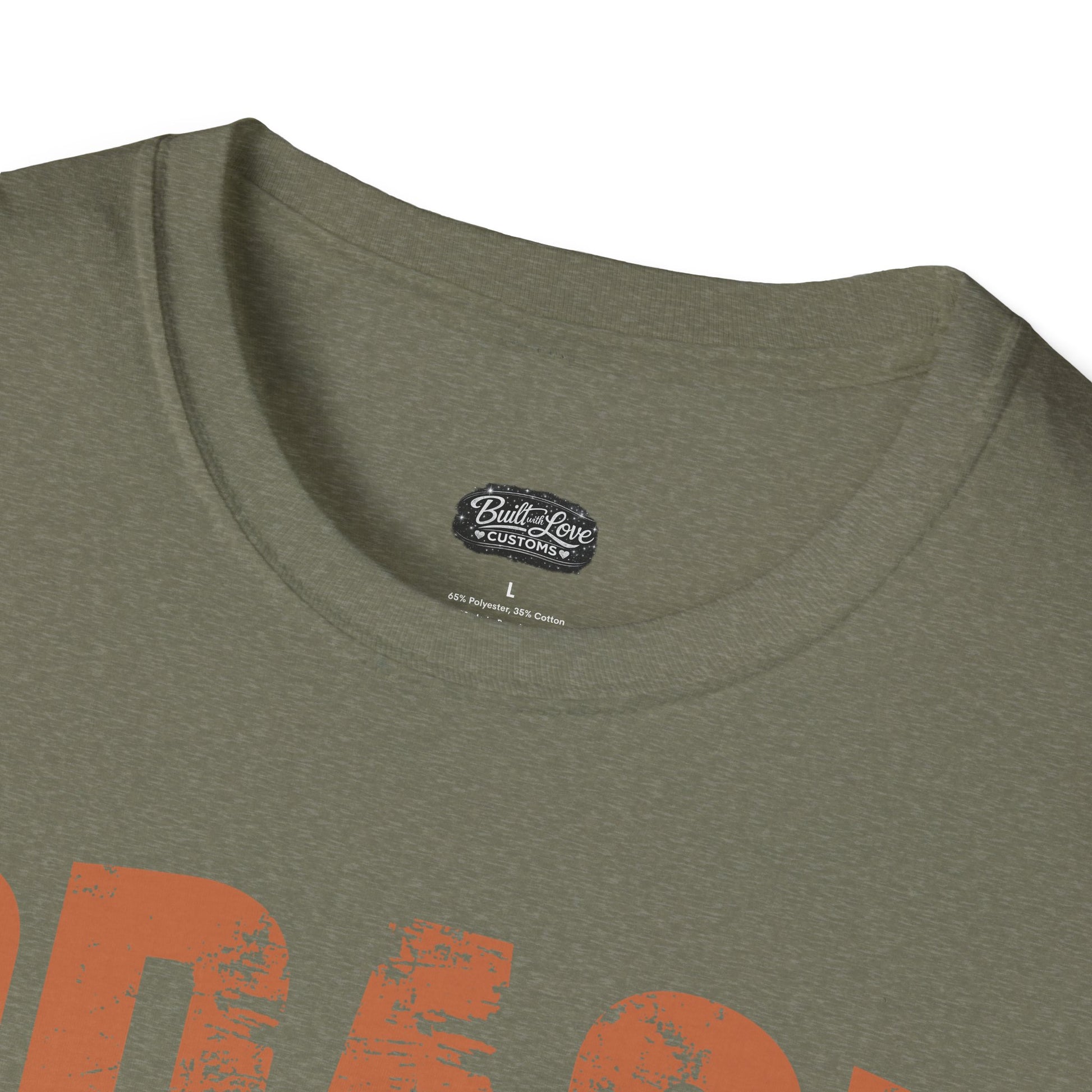 - DTG front print with DTF sleeve/neck label options; distressed rust ink design