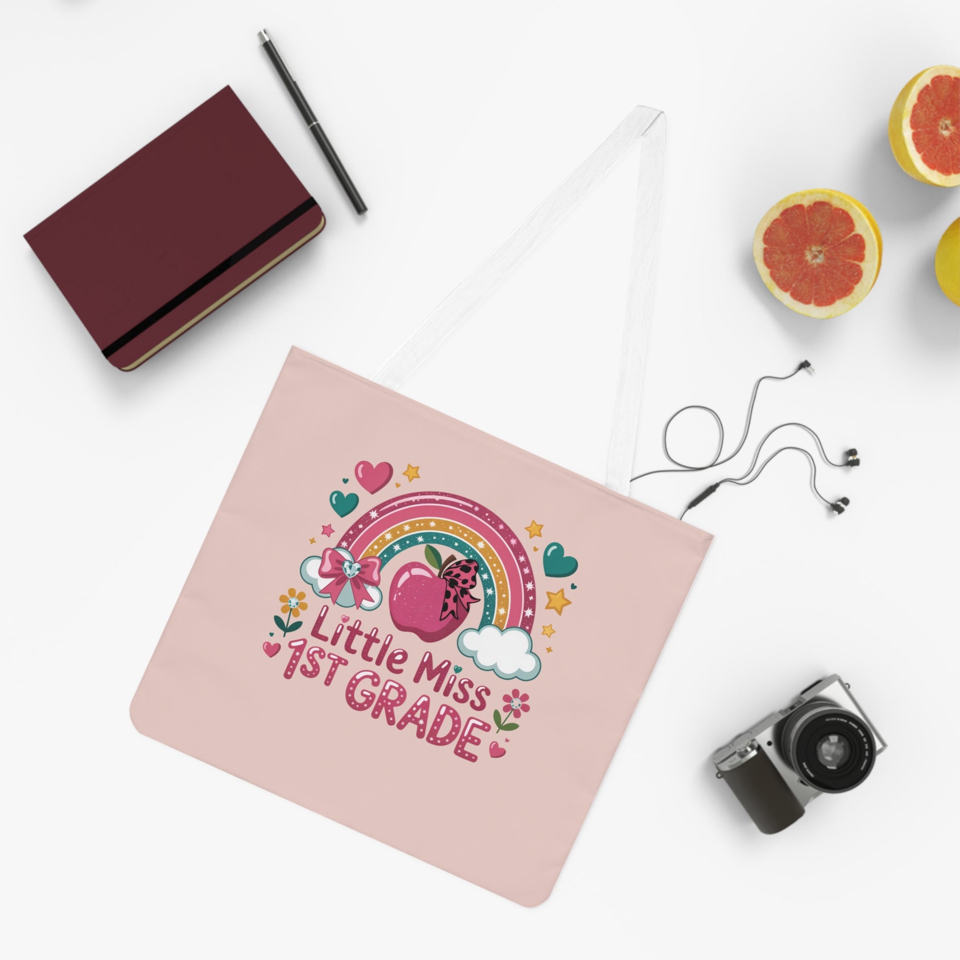 A soft, pastel tote that carries the excitement of a first-grade year wherever she goes. The lightweight cotton canvas feels familiar and easy on small shoulders, while the all-over blush print and cheerful central illustration — a rainbow, apple, bow, and playful hearts — announce ‘Little Miss 1st Grade’ with sweetness. It’s roomy enough for a lunchbox, picture book, or a few art projects, and the long white handles let it rest comfortably over a child’s shoulder. Thoughtful reinforced stitching at the handles and REACH-certified inks mean this bag is made for everyday use and bright school mornings.