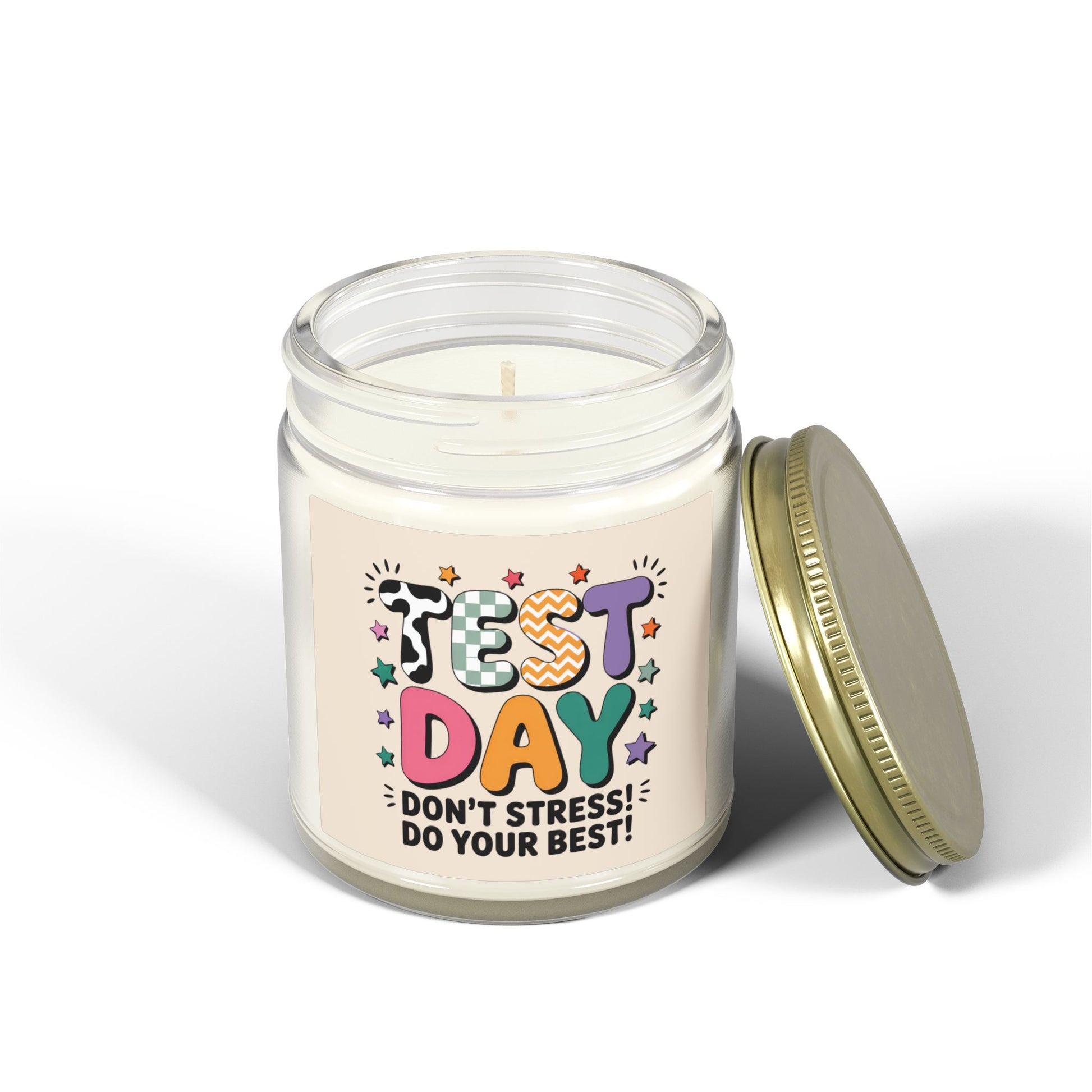 Light this small jar and breathe in a little calm. Hand-poured in the USA with clean coconut apricot wax and a cotton wick, this amber or clear glass candle offers gentle fragrance and a steady glow while you study, prep, or settle before a big moment. Labels spell out “TEST DAY — Don’t stress! Do your best!” in playful, upbeat colors — a quiet pep talk on your desk, nightstand, or study table. The gold lid keeps the scent fresh between uses, and when the wax is finished the reusable glass vessel becomes a pen cup, trinket jar, or mini planter. Choose from focused evergreen Fraser Fir, cozy Cinnamon Chai, soft Cashmere Musk, bright Beachwood, tropical Mango Coconut, classic Vanilla Bean, calming Lavender, fruity Blackberry Vanilla, or an unscented option for simple candlelight. Compliant with ASTM safety standards and made from non-toxic ingredients, it brings warmth and intention to exam week, late-night study sessions, or thoughtful care for someone facing a milestone.